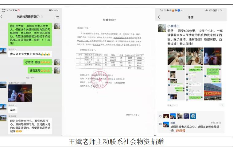 抗击疫情,万众一心。教师王斌在居家隔离期间,主动承担来自家乡河南省鹤壁市河南宝妈电子商务有限公司救援物资捐赠的联络对接工作。河南宝妈电子商务有限公司的救援物资经过10多个小时的运送已于2022年1月3日晚送达西安,定点捐赠给成人抖音 ,合计80832元抗疫物资。