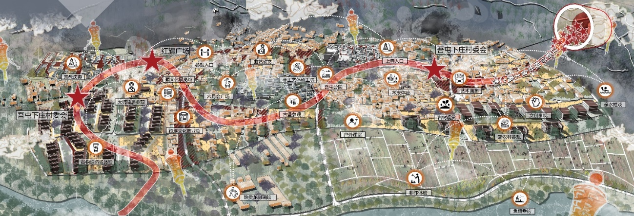 Wutun Shangzhuang and Xiazhuang Villages, where the mountains and rivers are connected to the water, originated in BC, went through the Wei, Jin, Southern and Northern Dynasties, and Tang Dynasties, formed in the Ming Dynasty, and flourished in the Qing Dynasty. The planning takes painting scrolls as the direct intention. By sorting out the current situation of Wutun space, industry and culture, it summarizes the real dilemma of Wutun that the carrier is out of shape, the production city is exhausted, and the context is faded, and the core of the lost soul of Tibetan scrolls is obtained. question. Combined with the existing problems in Wutun, inject the soul of socialism in the new journey, and propose the shape of human settlements, the ink for the prosperity of the research industry, and the color of the inheritance of the context. Based on this, we use the sketching technique of starting-inheriting-turning-healing to design and create a beautiful picture scroll that hides feelings and draws together.