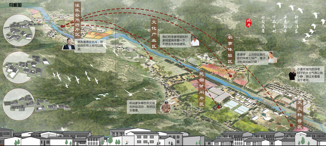 The work takes Beidou Village, Baoan Town, at the southern foot of the Qinling Mountains as the planning object. The plan introduces the "new endogenous development concept", which is guided by the internal improvement and external development of the village, based on sustainable development, and promotes de-hollowing from bottom to top. Attract external investment with internal resources and promote coordinated regional development. Through the integrated development of the four strategies of "increasing production, revitalizing villages, retaining people, and cultivating scenery", a new ecological village with integrated development of scenery, village, people and land will be formed, and a rural life in which people and land are integrated will be realized.