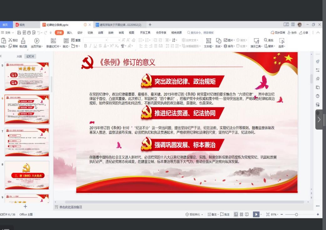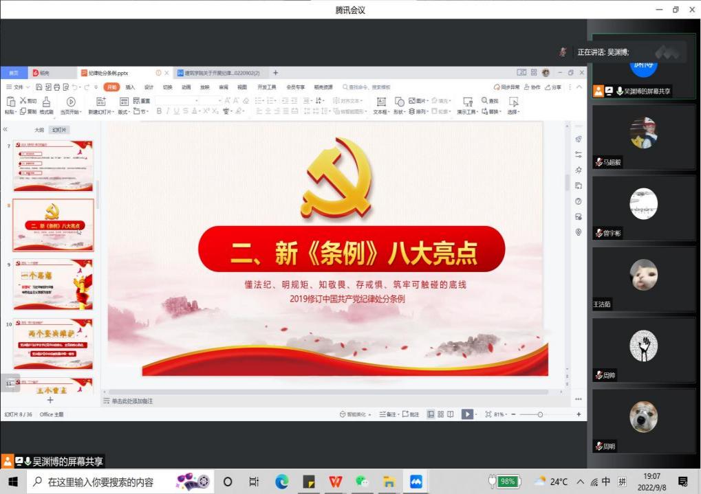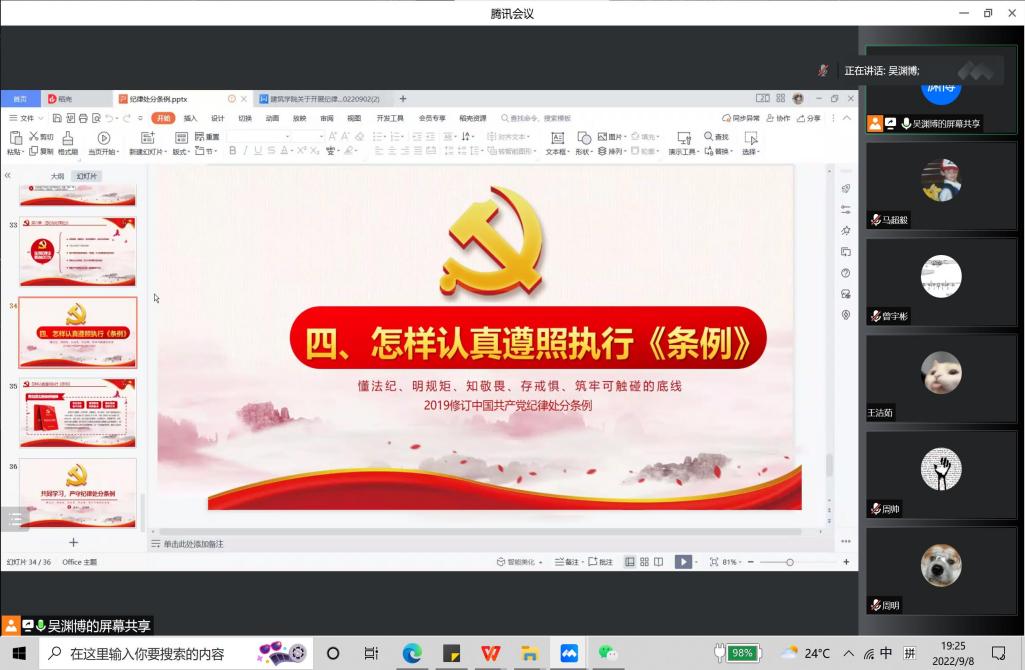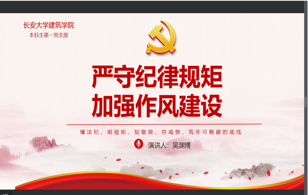 为落实全面从严治党要求和立德树人根本任务,根据学校开展纪律教育学习宣传月和师德师风宣传教育月活动的部署要求,成人抖音 本科生第一党支部于9月8日展开“严守纪律规矩 加强作风建设”学习活动,成人抖音 本科生第一党支部全体成员参加此次活动。通过纪律学习,提高支部成员的法纪意识,加强纪律作风建设,筑牢拒腐防变思想,廉政文化进一步升华,一体推进不敢腐、不能腐、不想腐成效显现。活动由吴渊博同志主持。