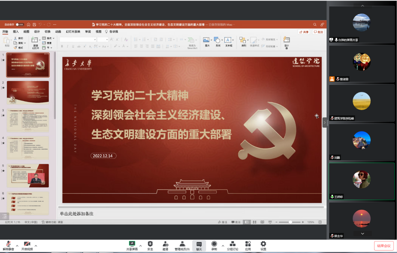 会议交流环节,李险峰指出,党的二十大报告从经济建设、政治建设、文化建设、社会建设、生态文明建设等方面,全面部署了今后五年乃至更长时间全面建设社会主义现代化国家、全面推进中华民族伟大复兴的各项工作,提出了一系列新思路、新任务、新举措。结合学院工作实际,大家从以下几点进行把握。一是作为党员领导干部必须完整、准确、全面贯彻新发展理念,坚持创新驱动发展战略,作为高校教师责无旁贷。二是基层党组织要把党的政治建设摆在首位,广大党员要坚定理想信念,把坚决做到“两个维护”落实到行动中。三是进一步坚定中华民族的文化自信,充分发挥学院学科专业的文化优秀,主动服务贡献学校校园文化建设。四是践行绿水青山就是金山银山的理念,主动对接乡村振兴等国家战略,要以此为契机,在研究上有举动,在理论上有创新,真正把的二十大精神落实到办学治院的全过程。