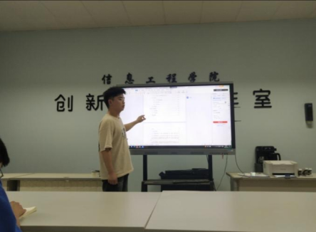 会议开始后,首先由信息学院崔茜璇对挑战杯创赛展开介绍,并分享了答辩经验和答辩ppt ,讲解如何调研实践设计一体四翼的有田助农模式和推出了智慧农田和智慧养殖方案。