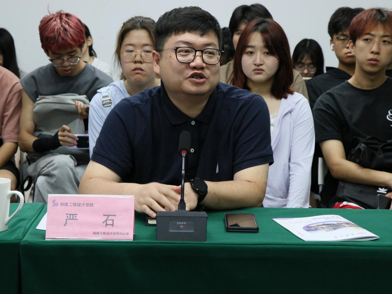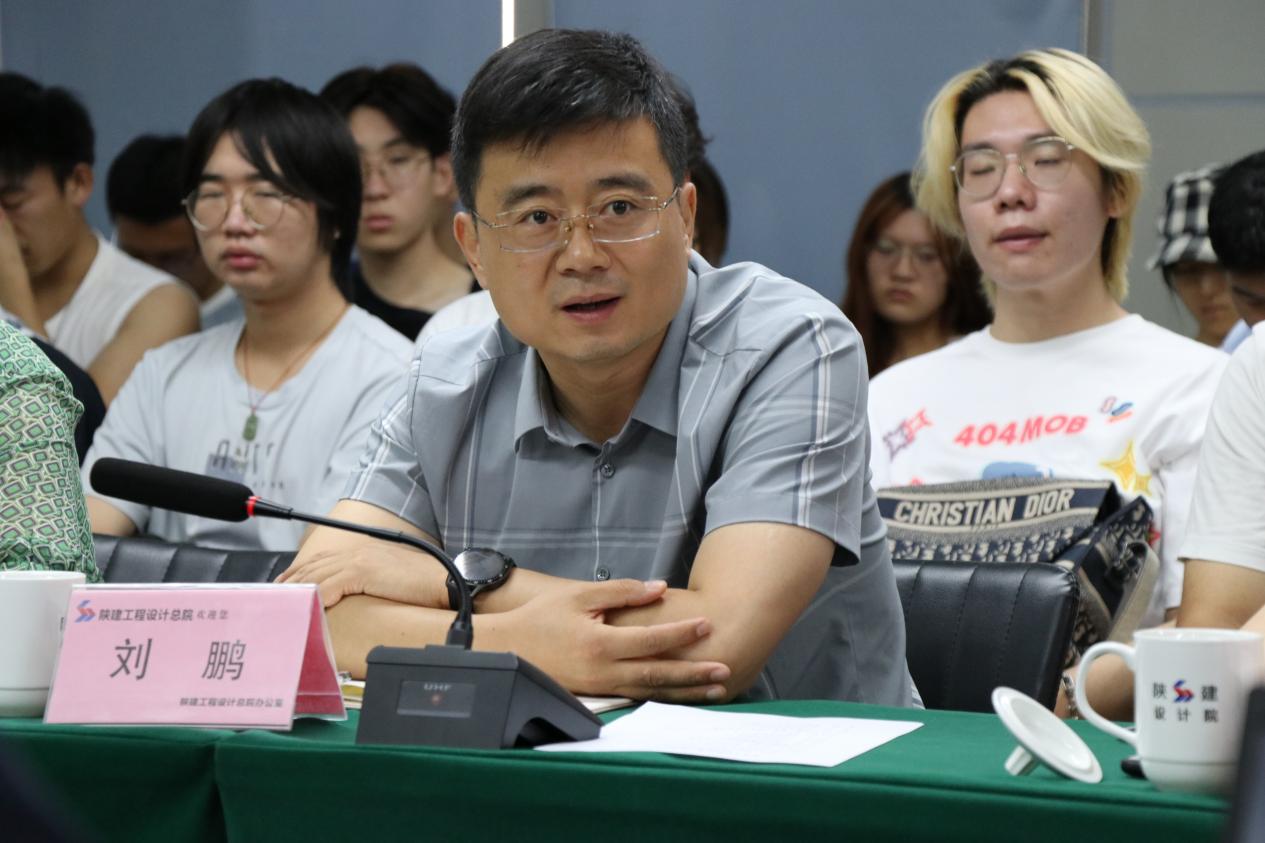 陕建工程设计研究总院副院长严石对刘鹏一行到来表示热烈欢迎,详细介绍了陕西建工集团的发展历史、营业规模、行业地位,讲述了工程设计院成立的背景、人员结构、营收构成、业务模式、业务范围、重点项目等情况。他表示,陕建工程设计研究总院近些年的发展方向已经由传统的设计模式转变为设计牵头的EPC工程总承包模式,逐步形成并完善了从项目前测模块到设计模块再到EPC管理模块的全过程管理模式,成功入住秦创原开展科研项目,希望以此次交流为契机双方能够进一步深化校企合作,共同搭建校企联合科研平台,拓展联合育人范畴。针对就业,严石建议在校学生要注重能力提升,学好专业知识,掌握学习方法;关注行业的发展动态,客观自我评价,早就业就好业;注重学习新工具、新技能,提升个人生产效率。