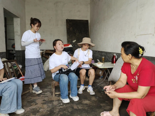 随后实践团队开展了山下具体调研。在村中唯一的农家乐中队员与老板进行了交流,老板带领实践队员实地查看了扩建农家乐的用地现状并讲述了自己对于用地功能的看法以及需求。随后实践队面向村子1组至5组的部分房屋进行察看和测量,对部分村民进行问卷调研和访谈,在访谈的几家个体户中了解到,他们改建过的房子依然有内部功能不足,村中人车通行道路狭窄等问题。