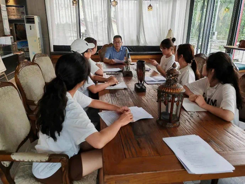 在指导老师谢更放的带领下,实践团队对当日实践成果进行总结汇报。实践团队对走访的七家农户情况进行了详细汇报,并对收集的问卷数据进行分析,归纳得出结论。谢老师指出可以针对任家山上和山下的实际情况,打造应地制宜的两种不同文旅体系,树立任家村独特的品牌,并对从三生空间角度对下一步构建产业农家乐模型的具体事项进行梳理。