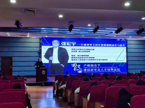 2023年10月26日14点30分,“回望长安”一产教融合下建筑类专业人才培养论坛(第六季)在成人抖音 北校区会议中心二楼报告厅正式举行。此次论坛特邀陕西建工集团股份有限公司工程设计研究总院副院长、高级工程师严石,深规院副总规划师、西北区域中心副总经理、西安分院院长、城市综合开发设计所所长李连财,中信建筑设计研究总院有限公司党委组织部、人力资源部总监凌洁雯,基准方中西安公司创意中心总经理、执行总建筑师张宏宇为作学术报告,主要围绕行业发展动态、企业宣传、人才需求等领域展开。成人抖音 招生就业处副处长赵磊、成人抖音 党委书记李险峰以及学院400余名师生参加本次论坛,论坛由成人抖音 党委副书记刘鹏和副院长余侃华共同主持。