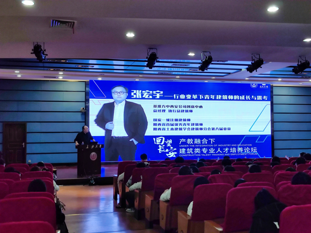 2023年10月26日14点30分,“回望长安”—产教融合下建筑类专业人才培养论坛(第六季)在成人抖音 北校区会议中心二楼报告厅正式举行。此次论坛特邀陕西建工集团股份有限公司工程设计研究总院副院长严石,深规院副总规划师李连财,中信建筑设计研究总院党委组织部、人力资源部总监凌洁雯,基准方中西安公司创意中心总经理张宏宇为作学术报告。成人抖音 招生就业处副处长赵磊、成人抖音 党委书记李险峰以及学院400余名师生参加本次论坛,论坛由成人抖音 党委副书记刘鹏和副院长余侃华共同主持。