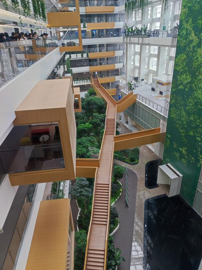 同学们依次参观了大厦中庭空间、工作区域及休息区域,近距离观察到建筑设计、建造、运维过程中所运用的环保低碳的绿色建筑技术、数字化办公系统以及智能化管理系统;体会到设计对处于建筑中的人及其行为所带来的潜移默化的影响。通过在建筑中的具身体验及工作人员的讲解,同学们被数字技术在建筑中的应用深深吸引,深刻感受到数字科技对建筑设计的引领、建筑智能与行为方式的结合。