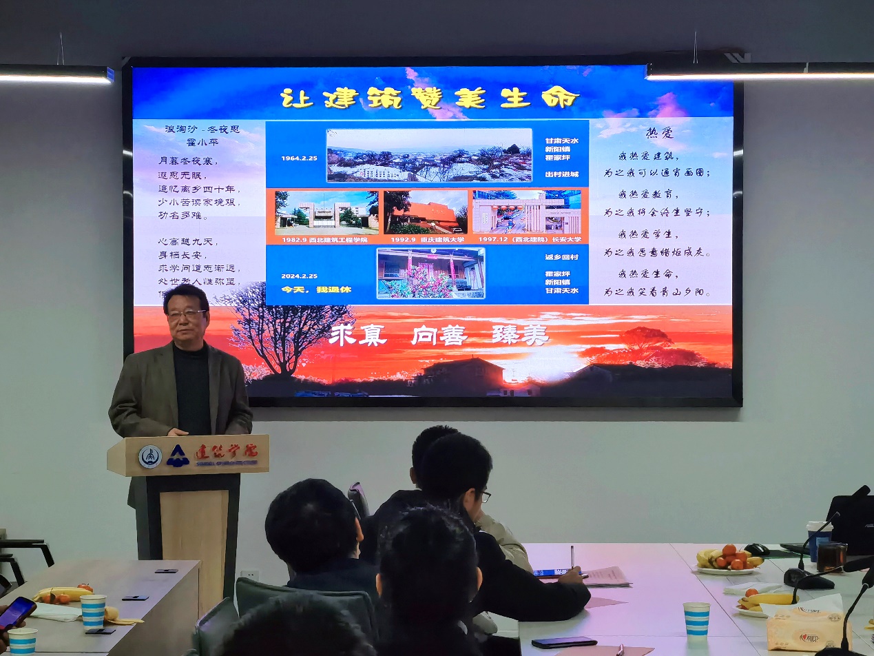 3月4日,成人抖音 在小寨校区建筑馆三楼会议室为霍小平教授隆重举行了“岁月如歌 薪火相传”——成人抖音 退休教职工荣休仪式。学院领导班子、各系所办主任及教职工代表参会。仪式由学院党委副书记、工会主席刘鹏主持。