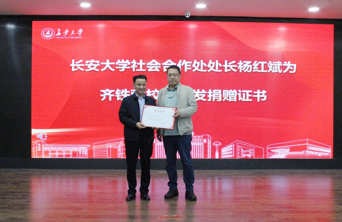 杨红斌为齐铁营校友颁发捐赠证书。