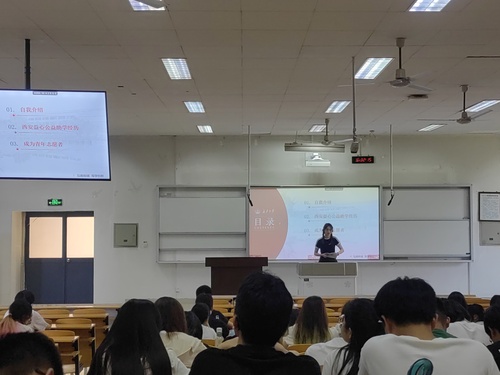 接着,陈婕文同学也为大家分享了自己连续两年在西安益心公益助学社会实践中的经历。她向同学们展示了自己的备课记录、教案等内容,讲述了作为一名公益助学项目志愿者所需要做的工作以及自己在此期间的收获。最后她以一名青年志愿者的角度与同学们交流了自己的心得体会,并鼓励同学们积极参与志愿活动。