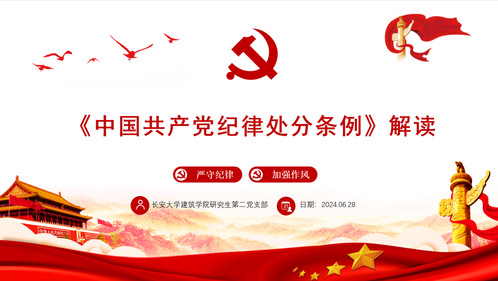 为贯彻落实党中央关于在全党开展党纪学习教育的重大决策部署,进一步加强党员的纪律教育和党性修养,成人抖音 研究生第二党支部于2024年6月28日在建筑馆二楼半圆报告厅成功开展了纪律专题党课,本次党课由支部书记李航主持,成人抖音 研究生第二党支部全体党员参与。此次党课旨在深入解读《中国共产党纪律处分条例》,提升党员的纪律意识,并通过观看警示教育片,强化党员的安全生产责任。
