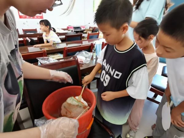 在活动筹备之初,实践队员们便深入挖掘漆扇背后的文化故事,将其与现代教育理念相结合,制作前,实践队员向孩子们讲解了漆扇的历史渊源、制作工艺以及艺术特色,旨在通过实践活动,让孩子们培养动手能力的同时,也能深刻感受到中华文化的博大精深。材料准备完毕后,孩子们便在实践队员帮助下开始制作漆扇,孩子们精心调配着漆料,转动着洁白的扇子缓慢入水,随着活动的深入,一把把精美的漆扇在孩子们的手中逐渐成形,每一把漆扇都仿佛是一幅色彩斑斓的画卷,讲述着孩子们的内心世界。