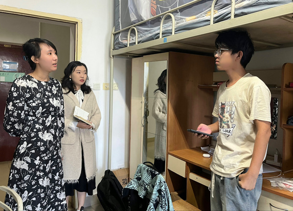 为深入了解在校生思想、学习和生活情况,做好国庆节假期校园安全工作,10月1日上午,学院党委副书记王妍婷及辅导员周艳龙、落昊飞深入学生宿舍开展走访活动。