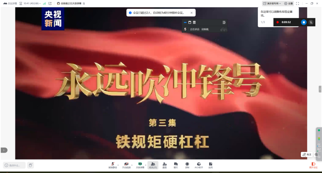 二、组织观看电视专题片《永远吹冲锋号》第三集《铁规矩硬杠杠》,深入学习“纪律红线不可触碰、规矩底线不可逾越”的深刻内涵,推动纪律教育入脑入心。