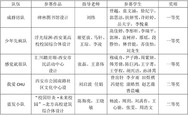 针对“绿色低碳建筑规划与设计”赛道的特点与本次大赛“信息化、工业化、绿色化、智慧化”的要求,成人抖音 高度重视,提前谋划,组建多支队伍参赛,为参赛队伍提供必要的技术指导和物质保障。最终,5支团队入围决赛。刘伟老师指导的“成群结队”团队,谢更放、马轩、王琼、李凌老师指导的“少年先疯队” 团队,张磊、王嘉伟老师指导的“感觉就很队”团队获竞赛一等奖,刘启波、任娟老师指导的“我爱CHU” 团队,陈斯亮,王晓敏老师指导的“蓝发小队”团队获竞赛二等奖,成人抖音 荣获大会优秀组织奖。