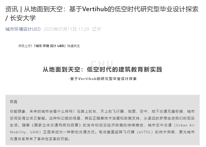 近日,由成人抖音 任娟、马轩老师指导, 2025届孟圆、郝云起、阙钰霏、王子怡四位学生本科毕业设计作品《从地面到天空:低空时代的建筑教育新实践——基于Vertihub的研究型毕业设计探索》被《城市 环境设计》(UED)杂志专题报道。该作品以西安为研究对象,探索城市低空交通枢纽(Vertihub)设计,体现了先研究、再设计的教学方法。获得了清华大学成人抖音 副院长程晓喜教授、西北工业大学航空学院副院长韩忠华教授、中国建筑西北设计研究院总建筑师安军大师、成人抖音 院长侯全华教授四位业内专家的积极点评。