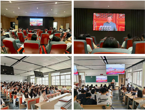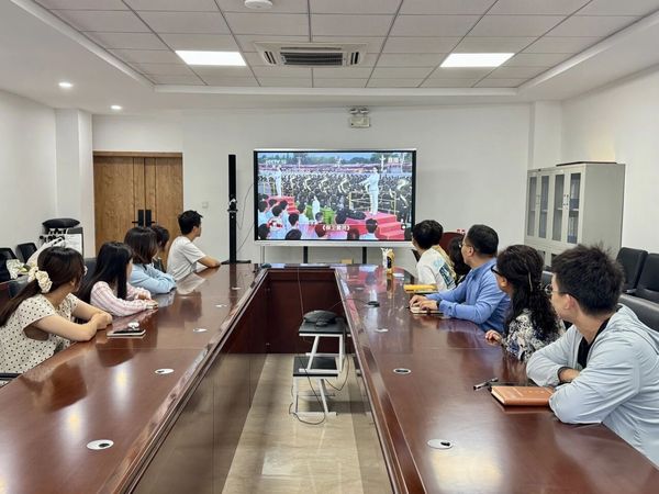 在学院组织员周文宁和全体辅导员的带领下,党支部及学生组织成员集中观看阅兵直播。会场布置简洁庄重,师生全程保持严肃观礼状态。镜头切换至抗战历史回顾时,全场屏息凝神;受阅部队昂首阔步通过天安门时,掌声久久不息。活动结束时,学生骨干集体宣誓“铭记历史,吾辈自强”,展现出青年群体的团结信念与行动自觉。