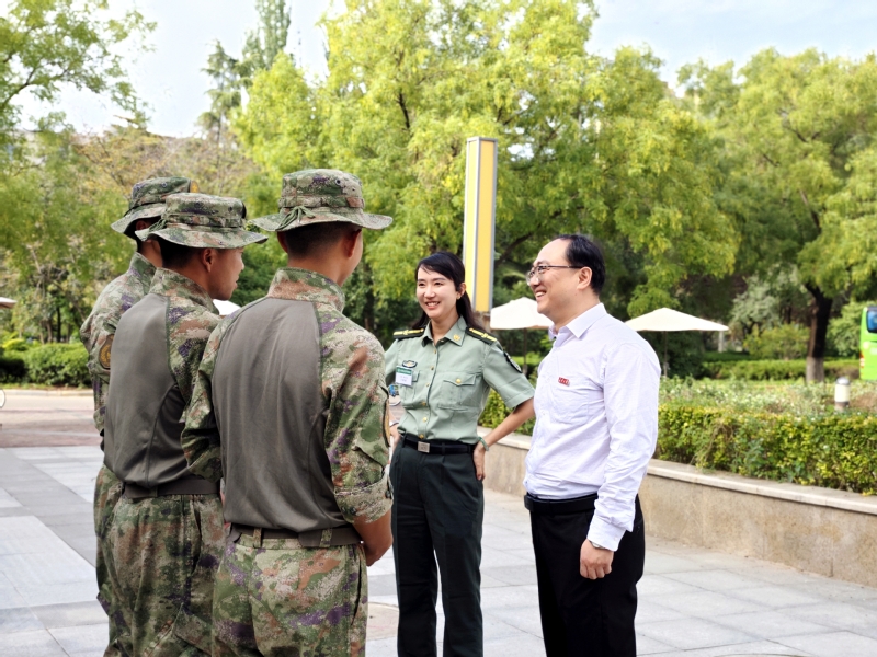贾侃代表学院对承训教官的专业素养与辛勤付出表达诚挚谢意。详细了解了军训开展情况、训练进度和学生表现,希望同学们珍惜军训时光,认真服从指挥,在训练中磨练坚强品格,增强集体荣誉感,以饱满的精神面貌开启大学新征程。